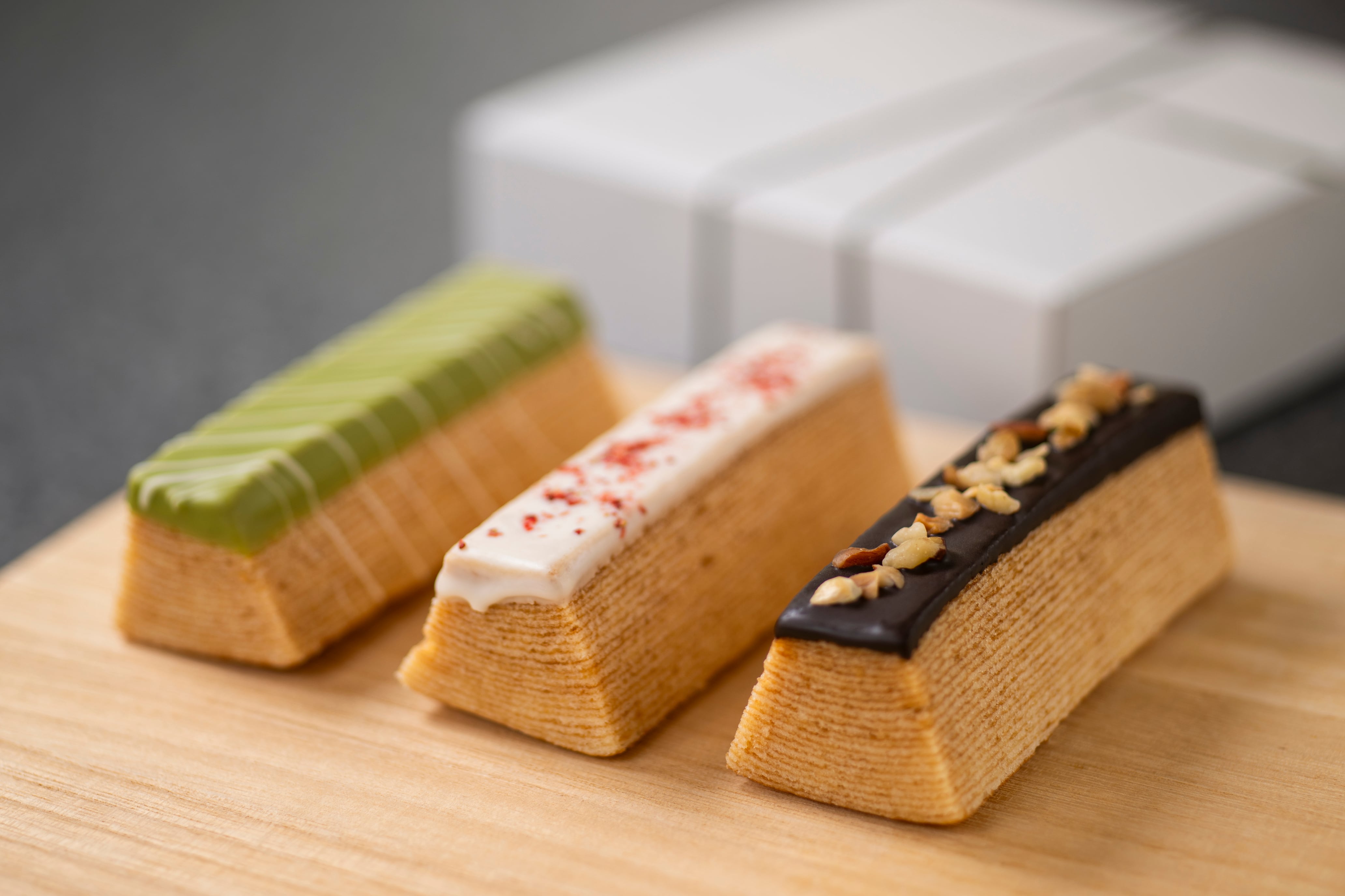 カットバウムクーヘンのアソートセット(3種類×各1本) ソフトタイプのバウムクーヘンをカットしてデコレーションしています。 【雪竹(せつちく)】修善寺の竹に雪がかかる冬の情景をイメージした抹茶とホワイトチョコのバウム 【紅白梅(こうはくばい)】紅白の梅が咲く修善寺の情景をイメージした苺とホワイトチョコのバウム 【薫衣香(くのえこう)】ラム酒とナッツがほのかに香る大人なバウム ●サイズ(1本):長さ約12㎝ 高さ約3㎝ ●箱サイズ:16.5×16.5×4.5cm ●賞味期限:製造日より30日 ●アレルギー品目:卵・乳成分・小麦・アーモンド ご注文から10営業日以内に発送いたします。 (オンラインショップ休業日:土曜日・日曜日・祝日・12月30日~1月3日) 送料やお支払い方法についは、下記ご案内よりご確認ください。
